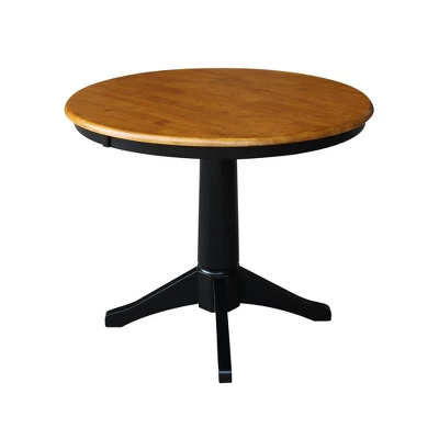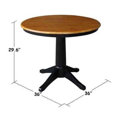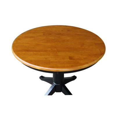 International Concepts home furniture is for those who appreciate high quality, wood furniture with a traditional and elegant look. This piece will beautifully complement your kitchen or dining room. This Round Table is made of solid wood ensuring years of use. It features a butcher block top and a pedestal base with four feet for maximum support. It has a dual-tone black and cherry finish. The table measures 36″ W x 36″ D. It is available in dining height, counter height and bar height options. The dining height table is used with dining chairs and is 28.9″ H.The counter height table is used with counter height stools and is 34.9″ H. The bar height table is 40.9″ H and is used with bar height stools. This Solid Wood table ships ready to assemble.