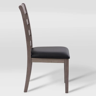 These ladder back classic washed gray dining chairs and table have clean lines and fit perfectly in any space. They have a high back for support and a foam cushion wrapped in a black leatherette that is durable and easy to clean. Coming in a set of four chairs and one table they are a cohesive mix of style and comfort, a great addition to your dining room.