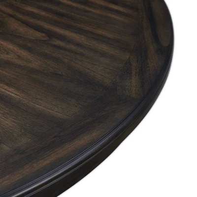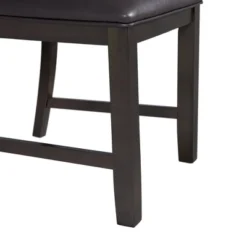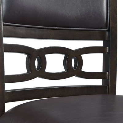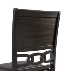 The Picket House Furnishings Taylor Standard 5PC Dining Set will look fantastic in your home! This set includes a table and four side chairs. This set is ideal for small space living allowing you to easily move around the round table top. The table also comes with a shelf in the base, while the kicked-out legs instantly add extra flair to this already stylish set. The chair backs and seats are upholstered in a black, faux leather, that pairs beautifully with the dark, walnut finish. Another cool design feature, the chairs have a link design in the back taking this set to the next level. Add this dining set to your home today for a look you’ll enjoy day after day!