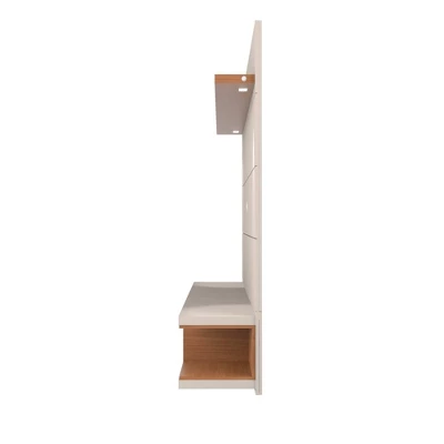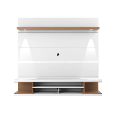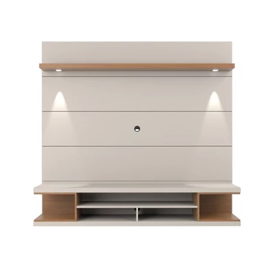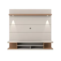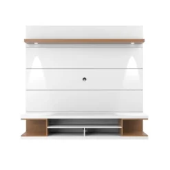 An entertainer’s dream backdrop in luxurious glossed off-white or white and maple cream, the Utopia Floating Theater Entertainment Center is modern, functional, sleek and sophisticated all at once. Equipped with convenient LED lights for a memorable movie night, open storage areas are perfect for tucking away DVD players, books, and all your media accessories, in one seamless theater room piece raising the standard and setting the bar high. Large enough to house a substantial television and built cleverly to hide away cable wires. Oak open shelves frame each end, while a middle section narrows to accommodate DVD players and catalogues.