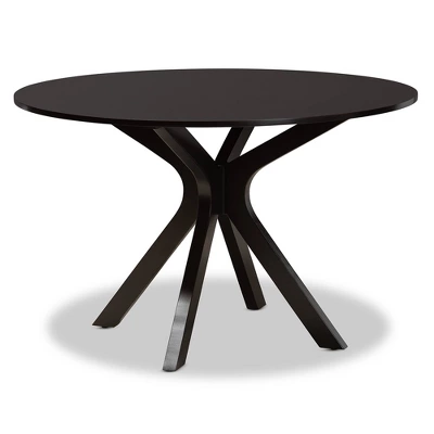 A unique expression of modern minimalism, the Jeane dining set enhances any dining space with its simple yet striking design. Made in Malaysia, the Jeane is constructed from sturdy wood and is comprised of six chairs and one circular table. Foam-padded seats underneath smooth faux leather provide plush comfort while the circular tabletop allows ample elbow room for each member of the table. Requiring assembly, the dark color scheme of the Jeane allows for easy integration with modern home decor. A set that radiates classic style, the Jeane dining set is a fantastic addition to any dining space. Chair Dimensions: 38.19″ High x 17.13″ Wide x 14.96″ Deep; Seating Dimensions: 18.5″ High (from Floor) x 17.13″ Wide x 15″ Deep; Back: 19.69″ High; Legs: 16.54″ High; Table Dimensions: 29.9″ high x 44.9″ wide x 44.9″ deep; Legs: 29.1″ high;