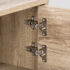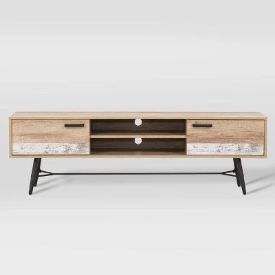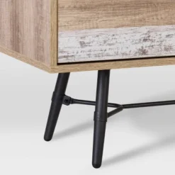 A mid-century modern design balanced with a warm rustic feel, this bench is a show-stopper in any entertainment or living room space. With ample storage and shelving space for all your A/V equipment. The beautiful duotone cabinet doors with high quality powder coated aluminum handles enclose the space to keep it organized, and splayed legs add support and style. Built to support TVs up to 80″.