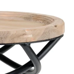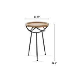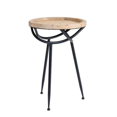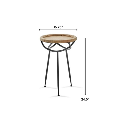 Spruce up any room with this versatile and trendy rustic accent table. This wood and metal table brings style and functionality to apartments, smaller homes, or any small room. Its black matte metal legs and round wooden top with a natural finish keep things simple while the metal woven design just below the tabletop brings a level of creativity to this piece. Brighten up a room by placing a plant on this table or put it next to your favorite cozy chair to use as a spot for a reading lamp, drinks, or books. It can even be used as a nightstand or bathroom table. This side table is ideal for mid-century, modern, and rustic-style rooms.