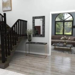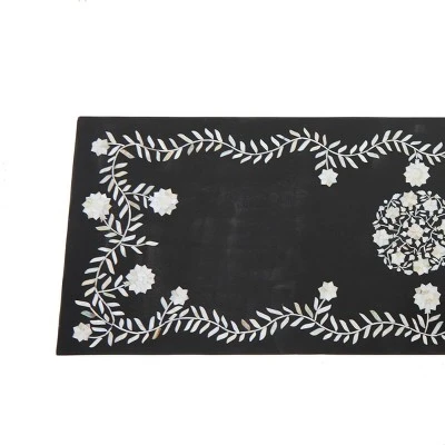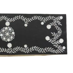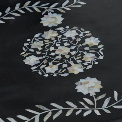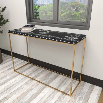 - Rectangular console table features deep black finish with mother of pearl details