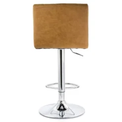 Add a stylish touch to your home bar or kitchen counters with the Elama 2 Piece Tufted Faux Leather Adjustable Bar Stool in Camel with Chrome Base. No handles ensure these stools fit easily side by side without the bulkiness. Features a swivel base and adjustable height with foot rest. This set comes with all the tools you need to put these stools together for an easy and fast assembly. Crafted from quality faux leather and sturdy metal for a strong and long-lasting design.