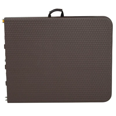 Add some pizzazz to your indoor or outdoor dining setting with this rattan-style folding table. This plastic folding table is a great option when you need a temporary dining surface or an everyday patio setup. The rattan weave top features a decorative straight-lined border, is 1.5 inches thick, and will seat up to six adults. Table is commercial rated for use in banquet halls and patios. Attractive gray powder coated legs lock securely in place while in use and non-marring floor caps protect your floor by sliding smoothly when you need to move the table. This durable, easy-to-clean table folds in half, making it easy to store and transport, using the convenient carrying handle attached on the side. Designed for both indoor and outdoor use, this plastic folding table is a convenient option for your home or business. Additional Features: Folds in half for storage and travel, Includes convenient carrying handle, Gray Powder Coated Locking Legs with protective floor caps, Legs fold underneath top for flat storage, Designed for Indoor and Outdoor Use