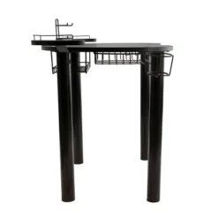 Gamers will love this all black, multi-functional gaming desk. From its carbon-fiber texture, curved top surface to the cylindrical steel legs, there is a place for speakers, headphone/VR headset, game controllers, a drink and games. A wire basket is large enough to store games and more. A rear wire basket holds a power strip positioned just below two wire management slots. Black carbon-fiber texture laminate gaming surface. Black powder-coated, cylindrical, steel, legs. Storage for speakers, headphone/VR headset, game controllers and more. Wire storage basket for games Power strip basket with two wire management slots to keep wires hidden.