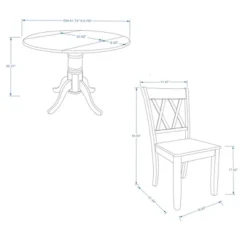- Dining Table dims: 41.73″ W x 23.62″ – 32.68″ – 41.73″ D x 30.31″ H; Table Top Thickness: .79″; Drop Leaf Depth: 9.06″; Pedestal Base 6.5″ Diameter x 22.84″, Top Fluted Section: 5.51″ H, Curved Mid-Section: 7.28″ H, Bottom Fluted Section: 10.05″ H.; Double X-Back Dining Chair dimensions: 35.04″ H x 17.91″ W x 21.46″ D; Seat height from floor: 17.52″; Seat dimensions: 15.75″ W x 16.54″ D x .87″ H; Width between Rear Legs at Seat: 14.17″; Height between seat top and rear-leg stretcher: 3.74″