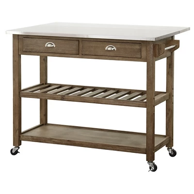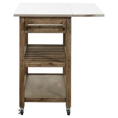 Bring portable storage and prep space to your kitchen with the Hadley Kitchen Cart with Drop-Leaf. Whether your current kitchen is lacking in cupboard space or you dream of a kitchen island, this cart has the functionality and handsome good looks to suit your needs. Use the adjustable open shelving to store extra pots, pans, and dishes, while storing utensils and other cookware in the two drawers. There’s even a towel rack on the side to keep your tea towels close to hand while you cook. The use of mixed materials allows you the versatility to seamlessly fit this cart in any rustic, farmhouse, or industrial style home with effortless ease. This kitchen cart is constructed from durable solid Acacia wood and stainless steel. Finally, the wood is finished in a wire-brushed Barnwood color which enhances the beauty of the Acacia wood’s natural grain.