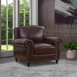 Meet where class tradition meets modern styling with beautiful top grain leather upholstery, rolled armrests and hand-curved hardwood legs. Antique brass nailhead detailing is featured throughout arms, rail sand frame adding the perfect final touch. The Hobson Chair by Abbyson is a must have for your living or entertainment space.