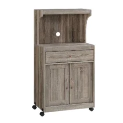 Equipped to provide ample storage and transitional design, the Home Source Charcoal Microwave Cart is the ultimate acquisition for your small kitchen space. The lower one shelf cabinet offers housing for pots, pans, dishes or dry goods while the centrally located drawer accommodates utensils and whatever miscellaneous paraphernalia that always seem to end up in the kitchen!’s counter top affords the ideal location for your microwave while the backdrop’s opening provides easy access to electrical outlets. Top shelf offers handy access to cookbooks and savory ingredients. Constructed on casters, the Home Source Charcoal Microwave Cart is outfitted for total mobility should the need arise.This small kitchen storage wonder is finished in a warm brown cherry laminate and accented with nickel hardware making it the ultimate transitional element in your small kitchen space.