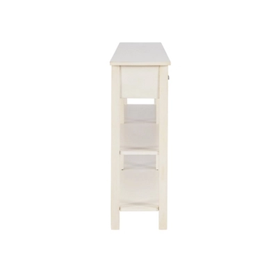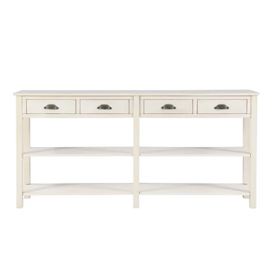 Highlight any space with a Farmhouse style extended Console Table for a light, airy look. Features an antique Cream crackle finish, cast antique bronze drawer pulls, and generous shelf space for display or storage. Simple charm won’t overshadow your precious items. The perfect addition to any room, you will absolutely love this piece!
