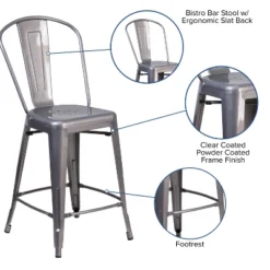Modern minimalism best defines this agile bar stool that works well in contemporary home settings. Simplistic in its design, the slatted back profile provides versatility while the powder coated metal construction is sleek, strong and lightweight. Plastic floor glides protect home flooring surfaces, and the well-crafted frame supports up to 500 lbs. of weight capacity. Additional Features: Assembles with Illustrated Step by Step Instructions, Item Size: 17.75″W x 22″D x 40.5″H; Seat Size: 14″W x 14″D x 24.5″H; Back Size: 17.75″W x 17″H