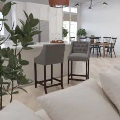 Add an air of modern sophistication to any room with this beautitful barstool featuring a black tufted faux leather seat with accent nail trim and dark walnut finish frame. This upholstered stool is perfect for the kitchen island as well as entertainment spaces in any home. The ergonomically plush cushion is designed to provide comfort and reduce pressure on your legs, while the lower support beam doubles as a footrest. With this barstool, style is never sacrificed for comfort; giving you the best of both worlds while you eat, drink and relax.