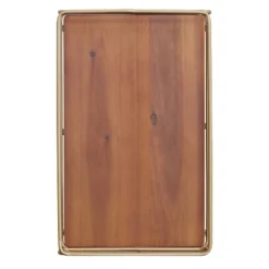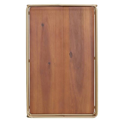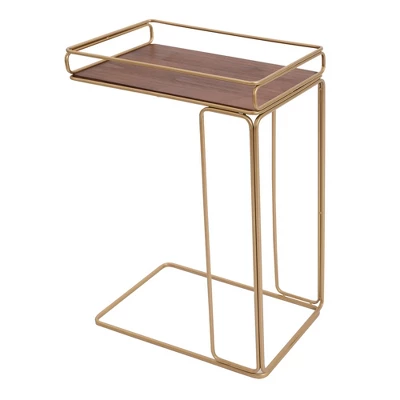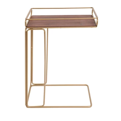 With a minimalist and industrial style, this side table is sure to bring charm to your home office, living room, lounge, or bedroom. With a convenient C shape structure, the piece can be stored more easily and items can be moved under the open end for space saving purposes. The piece showcases subtle grain details on the tabletop, being crafted completely from solid wood and a metal frame for lasting durability, it is accented brown and gold tones. The raised metal barrier on the tabletop prevents items from falling off, while the sleek minimalist design of the frame overall grants it a stylish edge over other accent pieces. The spacious tabletop offers plenty of space to keep your everyday items, a lamp, or decorations. The piece can be used in a variety of ways, and it brings a fresh, elegant aura to any room it is brought into.
