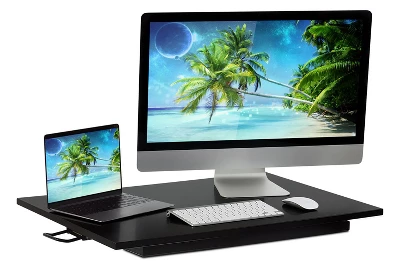 This sit-stand desk converter elevates your computer or laptop to a comfortable height for an improved viewing experience and better posture. The spacious tabletop on this converter supports a monitor and a laptop or tablet. Moving from sitting to standing can be done in a matter of seconds thanks to the spring mechanism built into this design. Simply squeeze the lever on the side of the desk, and the desk will raise and lower in a smooth, fluid motion. Ready to use right out of the box.