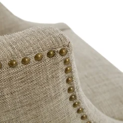 Elevate your dining space with the Powell Swivel Counter Height Barstool. This swivel counter stool is upholstered in a tweed fabric and features a low back, for a chic transitional design. The walnut colored solid wood legs contrast the upholstery to create a stunning look. An antique bronze nailhead detailing on the recessed arms and back adds an elegant touch to the design, while the bronze metal kickplate ring provides added durability. Perfect for your kitchen area, this swivel counter stool adds a charming farmhouse-inspired update to your dining decor. Leg assembly required and tools are provided.