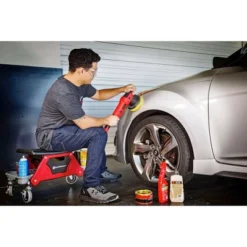 The Heavy Duty Rolling Work Seat with storage trays is the perfect solution for those who want to work in comfort. This solid rolling work seat will eliminate the need for squatting and kneeling, making short projects or long hours on the clock much easier. The work seat features robust 4-inch rubber lockable wheel casters that can roll over any surface. It also comes equipped with a full-size pullout drawer and dual over-sized removable trays, ensuring that you always have the right tools on hand. The add-on bottle/cup holders are great for spray bottles or a refreshing beverage. The seat is designed for maximum comfort with an injected poly-foam concave cushion that allows for hours of turning wrenches or detailing. With its durability and comfort, the Heavy Duty Rolling Work Seat is the perfect rolling workspace for any job.