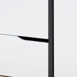 Create a playful retro feel in your dining space with the Reed sideboard. Constructed from wood, the Reed features a complementary color palette of white, oak, and gray for a cool, modern look. Two doors open to reveal four shelves with ample space to store plates and glassware. Additional storage space is provided by one open shelf and two drawers. Inspired by mid-century modern design, the Reed features clean lines and a low profile. Cut-out handles add a unique touch. The Reed sideboard is made in Malaysia and requires assembly.