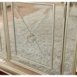 The Prospect Metallic Gold coats the framework for the mirrored panels which covers the surfaces of our beautiful credenza. Beveled on the front three door panels, and with an interior ideal for storage, a stunning addition to foyer, den or dining area. This credenza will ship without any assembly required.
