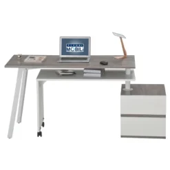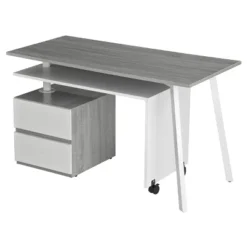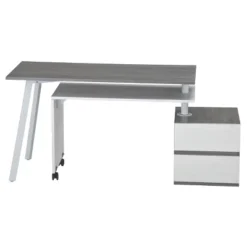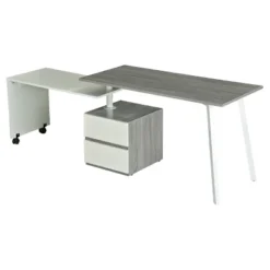 This Modern Techni Mobili Rotating Workstation offers just the right amount of desktop space needed for every task. Its unique design of rolling caster-equipped side table, pivots around a two-drawer cabinet. Customize the table to an L-Shape for corner areas, extend it for a more wider surface or close it for tighter spots. This space-saving nested desk is made of MDF panels with a moisture-resistant PVC laminate surface, supported by sturdy legs of powder-coated steel. Color: Gray