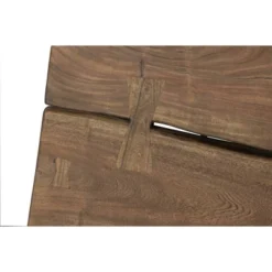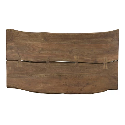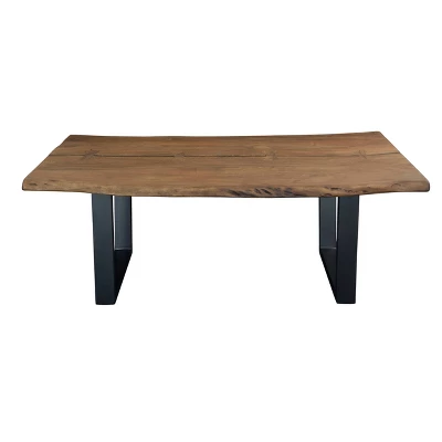 U-shaped metal supports form a perfectly simple base for this table’s focal top of two generously-sized boards connected by a center row of eye-catching bowtie key joinery. Eased edges follow the natural curves of the wood, while a Sequoia Light Brown Acacia finish highlights all the organic beauty of the grain.