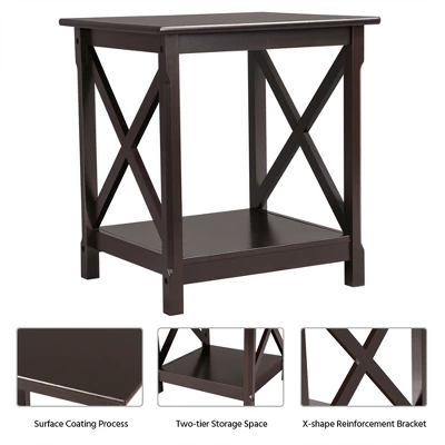 - Fit this chic X-design end table into your space, and you’ll see how perfectly it blends with a bedroom or living room. 2 storage tiers of P2 MDF and pine wood materials are spacious, safe and durable to use. Rounded corners will protect you from accidental bumping hurt. A chair side coffee table, bedside nightstand or guestroom sofa side table.