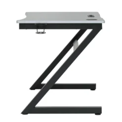 The Zone PC Gamer Computer Desk with Charging Station, Cup and Headphone Holder by SD Gaming features a large 45.25 w x 27.5” deep gaming surface with a simulated carbon fiber finish and a beveled front cut out that keeps you closer to the monitor without sacrificing room for your accessories. It also provides gamer specific features: a cup holder and headphone hook that save desktop space. This gaming table has a power console that provides 3- grounded outlet receptors and 2-USB charging ports to keep your accessories powered. The desktop also has a cord management hole with cover for organizing your electrical cords. The steel frame has a powder-coated finish that resist scratches and corrosion. The floor levelers and crossbars provide stability.